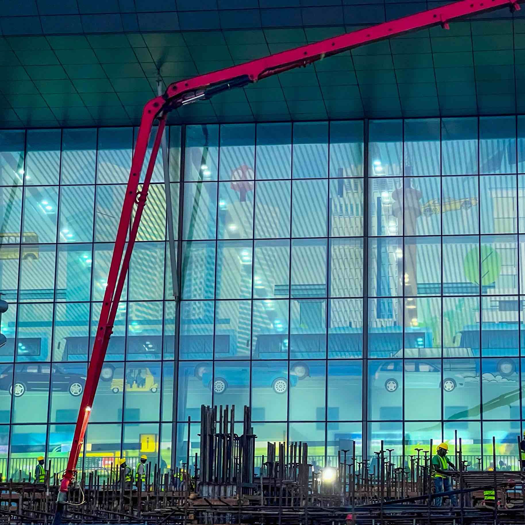 At the international wing of the airport in Lagos, construction workers move across scaffolds and concrete platforms as traffic flows in and out of the terminal.